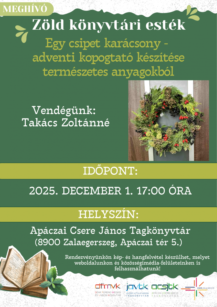 A „Zöld Könyvtári Esték” programsorozat tovább folytatódik az Apáczai Csere János Tagkönyvtárban. Ez alkalommal Takács Zoltánné lesz a vendégünk, aki adventi kopogtató készítésében segíti az érdeklődőket. Fontos: a program regisztrációhoz kötött, regisztrálni a könyvtár elérhetőségén lehet: e-mail: apaczaiamk@gmail.com; illetve telefonon: 92/314-866.
