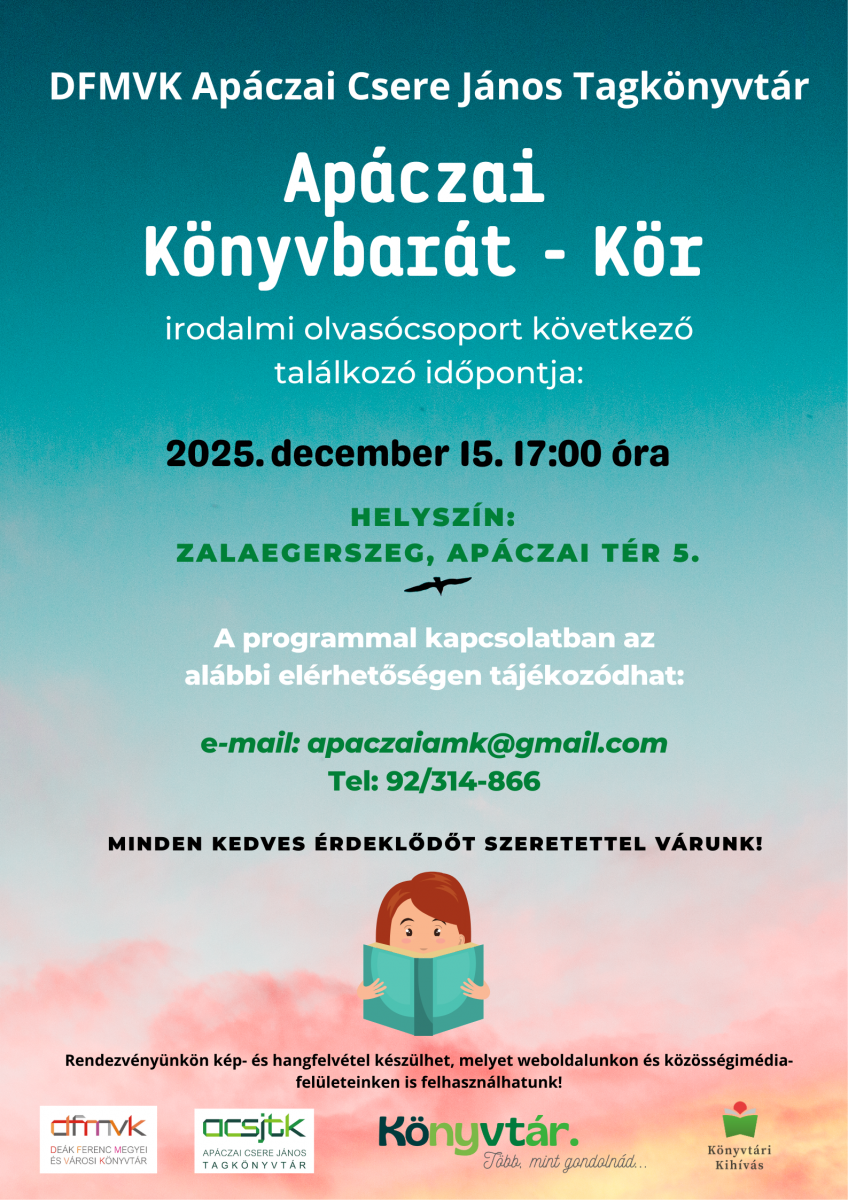 Az Apáczai Könyvbarát Kör következő találkozójának időpontja 2025. december 15. (hétfő) 17:00 óra. Részletek a plakáton.