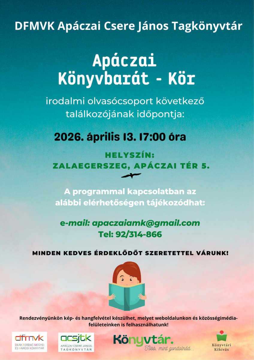 Szeretettel várjuk az érdeklődőket az Apáczai Könyvbarát Kör következő programjára. A találkozó remek alkalom az olvasás, a könyvek és a közös beszélgetések kedvelőinek. A részletek a plakáton olvashatók.