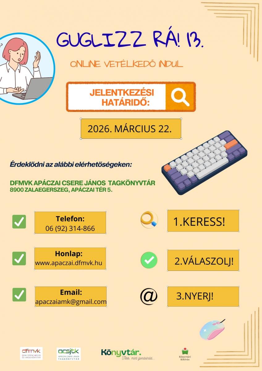 Guglizz rá! online vetélkedő indul felnőtteknek. Ha szeret játszani, gondolkodni, utánanézni érdekességeknek, akkor jelentkezzen az izgalmas, többfordulós online vetélkedőre, ahol irodalmi, műveltségi és játékos feladatok várnak Önre! Részletek a plakáton találhatók. Várunk minden érdeklődő felnőttet szeretettel!