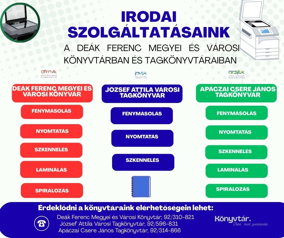 Könyvtárainkban az olvasás mellett irodai szolgáltatások is segítik a mindennapokat. Nyomtatás, fénymásolás, szkennelés és további lehetőségek várják látogatóinkat. Látogasson el hozzánk, és vegye igénybe szolgáltatásainkat!