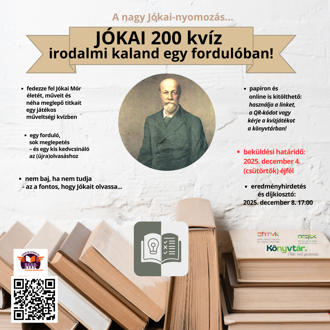 A 200 éve született Jókai Mór emlékére készült ez a kvíz, hogy közösen idézzük fel a nagy mesemondó alakját, műveinek hőseit és gondolatainak időtálló erejét. Töltse ki a kvízt, és merüljön el a 19. század magyar irodalmának varázsában! A megfejtéseket egy élő eredmény-hirdetés keretében tesszük közzé, ahol a legjobb kitöltőket meg is jutalmazzuk.