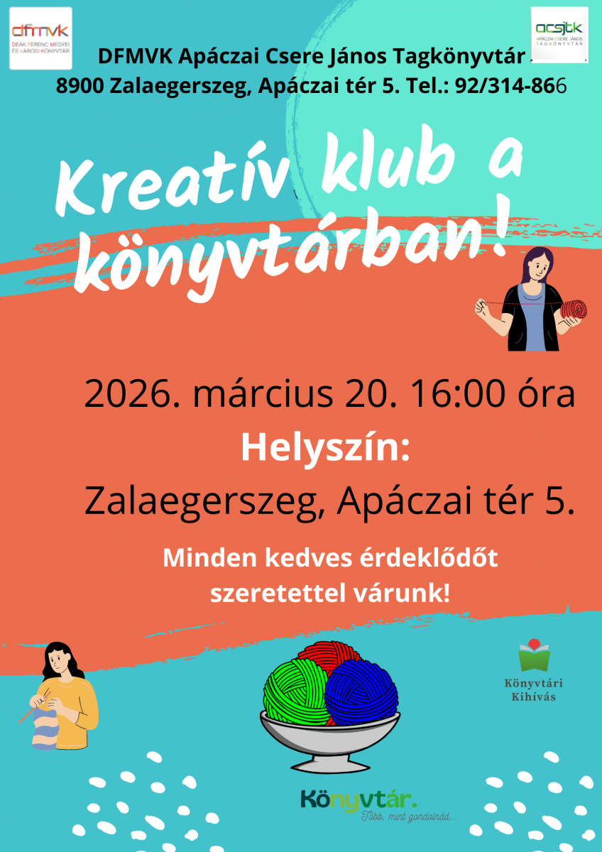 Szeretettel várunk minden alkotni vágyót 2026. március 20-án 16 órától a Kreatív klub következő foglalkozásra. A program minden korosztály számára nyitott.