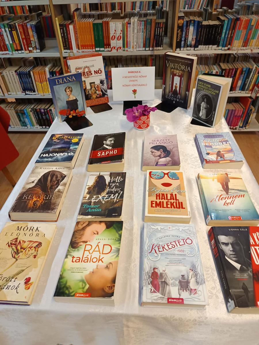Ahogy ígértük, egész héten friss nőnapi könyvajánlóval jelentkezünk. Válogatásunkban női írók kötetei, valamint inspiráló, híres nők életét bemutató könyvek kaptak helyet. Természetesen a könyvtárunkat is ünnepi díszbe öltöztettük, hogy még hangulatosabban válogathassanak az olvasnivalók között.
