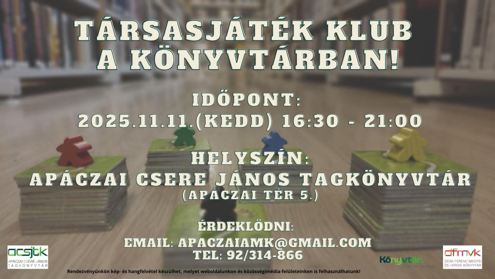 A könyvtár nemcsak a könyvek, hanem a közösségi élmények otthona is. A Társasjáték Klub azoknak a felnőtteknek szól, akik szeretnének kiszakadni a hétköznapokból, kikapcsolódni és jó társaságban eltölteni néhány kellemes órát.