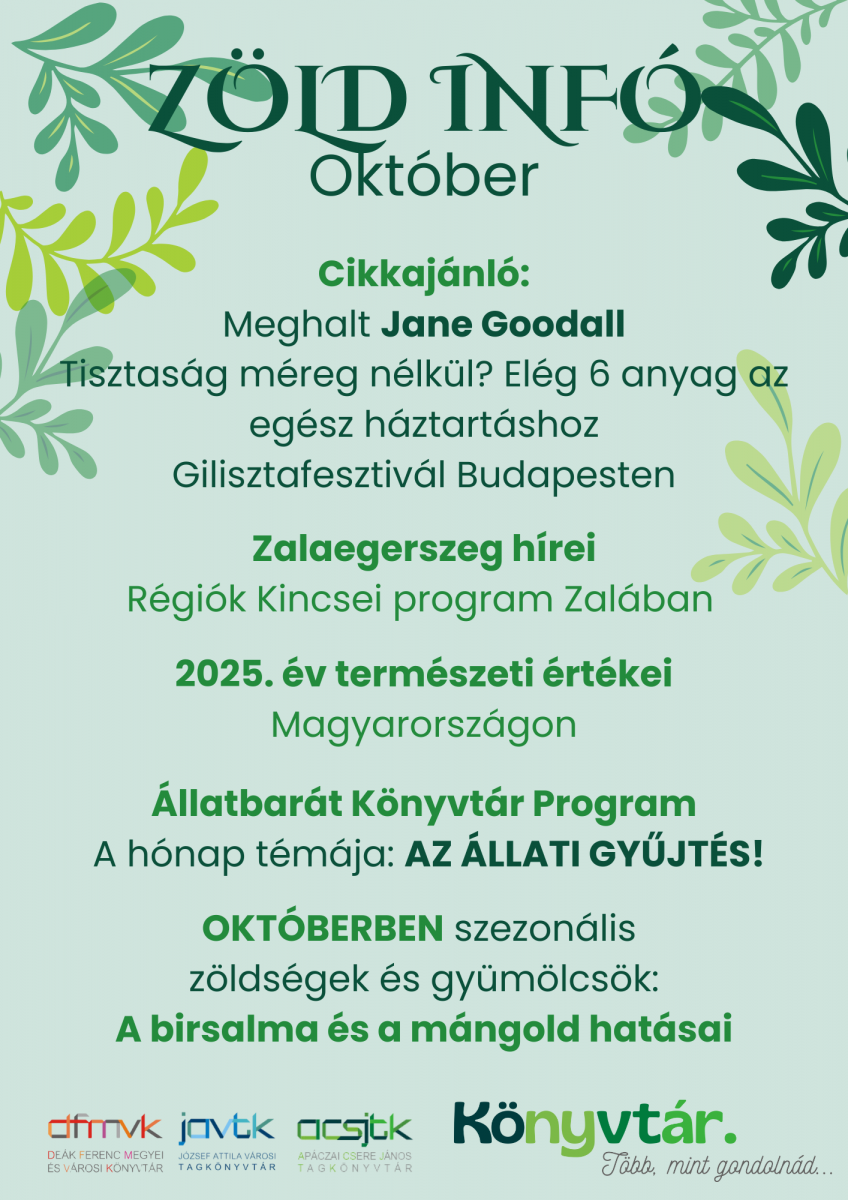 A Zöld Könyvtári hírek legfrissebb információi az alábbi linken érhető el: Zöld Könyvtári Hírek - október