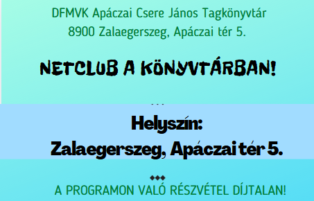 2019 januárjában indult el könyvtárunkban az idősebb korosztály részére a Netclub. A foglalkozások havi egy alkalommal kerülnek megrendezésre, mindig a hó harmadik hétfőjénn 15 órai kezdettel. Különféle internethasználati témákkal, gyakorlati tanácsokkal foglalkozik. Bővebben tájékozódni az alábbi elérhetőségeken lehet: